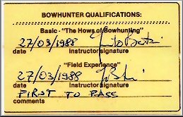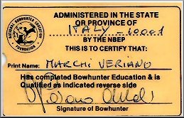 Vale la pena ricordare, per comprendere quanto le cose sono cambiate nel nostro mondo che, nel 1988, nonostante vi fosse già da qualche anno la possibilità in Italia di fare un corso di caccia con l'arco ed acquisire un'abilitazione ufficiale internazionale, nessun arciere ne aveva ancora fatto richiesta tant'è che nello spazio del brevetto riservato ai commenti mi onoro di avere la nota "First to pass".